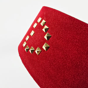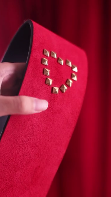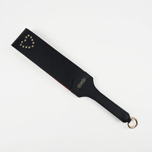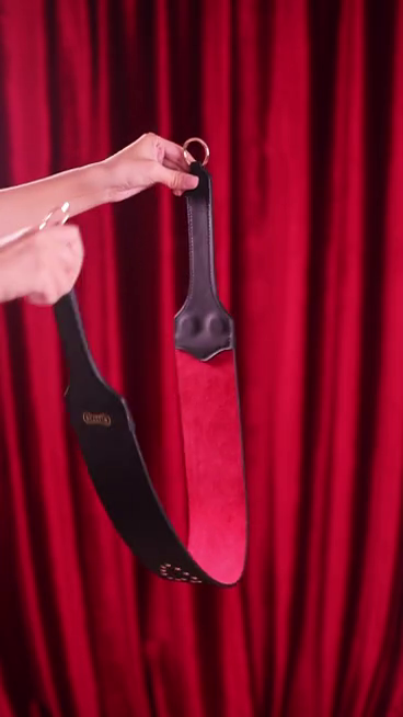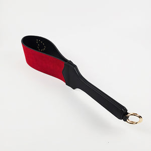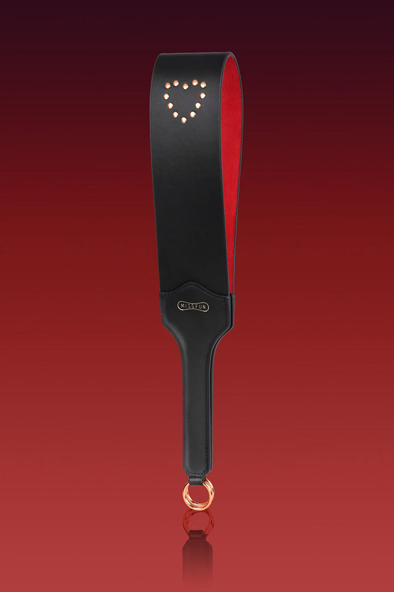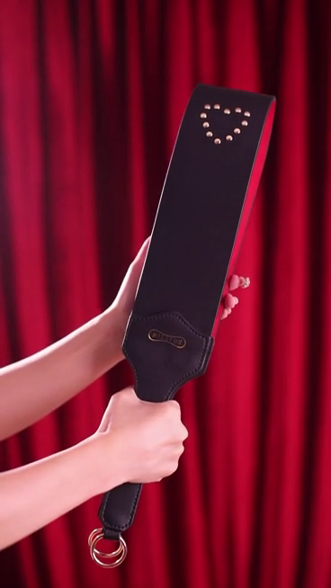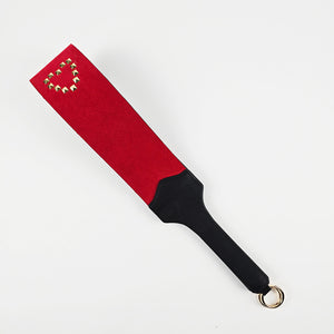 The wide striking face delivers a deep, thuddy impact that lands and stays. One side is smooth black vegan leather with golden round studs in a heart shape for clean, bold strikes. Flip it over and you get red suede with diamond-cut golden studs that add grip, texture, and a teasing bite with every swing.